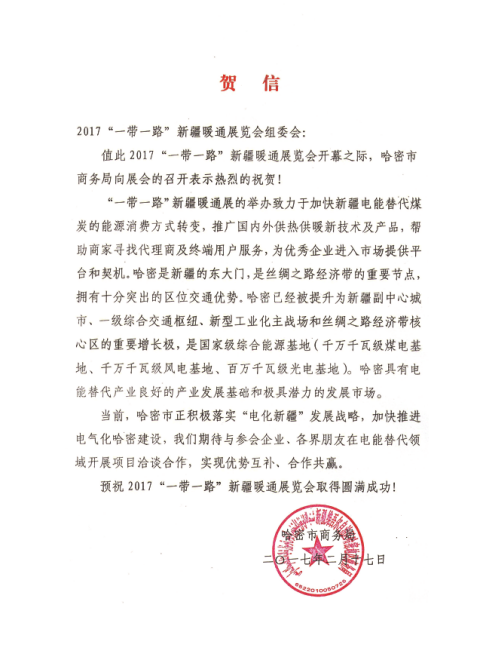 近日,新疆暖通展覽會觀眾組織部正在緊鑼密鼓的進行全疆各地州的觀眾組織工作,全疆各地州相關部門對展會的舉辦表示大力支持,并組織企業組團參觀展會。昌吉住建局、哈密商務局、克拉瑪依住建局等回函表示將參與展會并就最新電采暖、“煤改電”、“煤改氣”技術與現場200余家知名企業及企業代表進行溝通交流,共同促進“電氣化新疆”政策的實施。