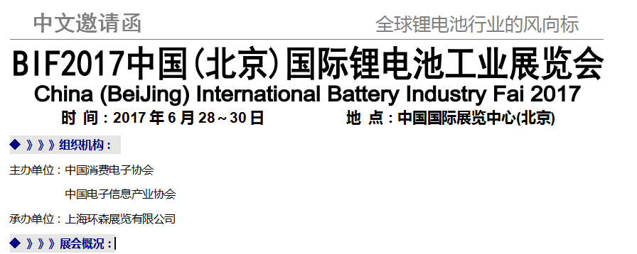 為了更好的推動鋰電池行業(yè)的發(fā)展,在得到相關主管部門的大力支持下,BIF2017中國(北京)國際鋰電池工業(yè)展覽會將于2017年6月28~30日在中國國際展覽中心(北京)隆重舉行。本次大會將以“突出品牌、開拓創(chuàng)新、注重實效”的辦展宗旨,憑借獨特的創(chuàng)意,科學合理的整合傳播和卓越的服務,以全新的理念為廣大參展商提供一個“高水準、高品位、高質量”的展示交流舞臺,打造集鋰電池行業(yè)最具規(guī)模、最有價值和最具權威的頂級盛會,本次展會期待您的參與。