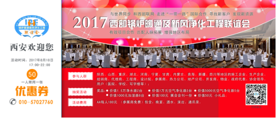 與世界同步 和西部聯網 走進一帶一路國際合作 尋找新客戶 發現新資源。為了促進行業內企事業單位的交流合作,大會同期舉辦:2017西部鍋爐暖通及新風凈化工程聯誼會, 有效項目合作,匹配人脈拓展,增強地區布局,入場券如下。