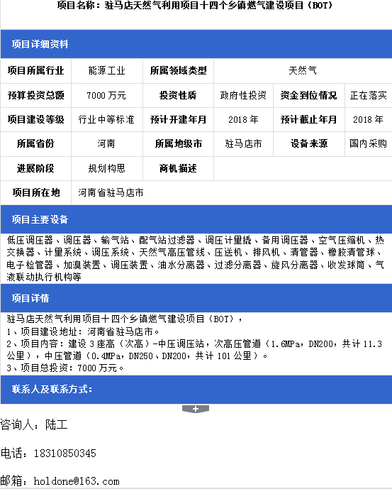 項(xiàng)目名稱:駐馬店天然氣利用項(xiàng)目十四個鄉(xiāng)鎮(zhèn)燃?xì)饨ㄔO(shè)項(xiàng)目(BOT)